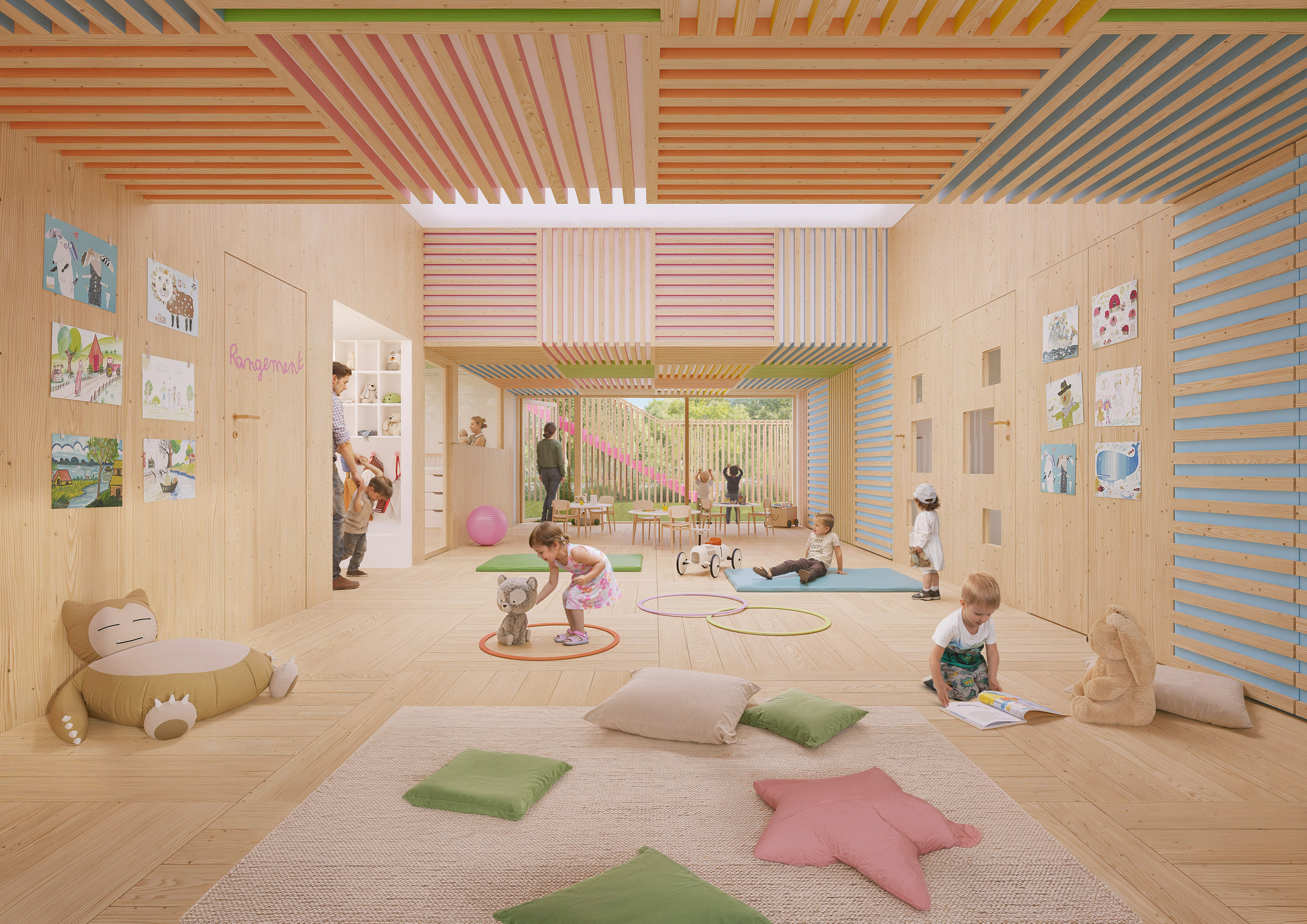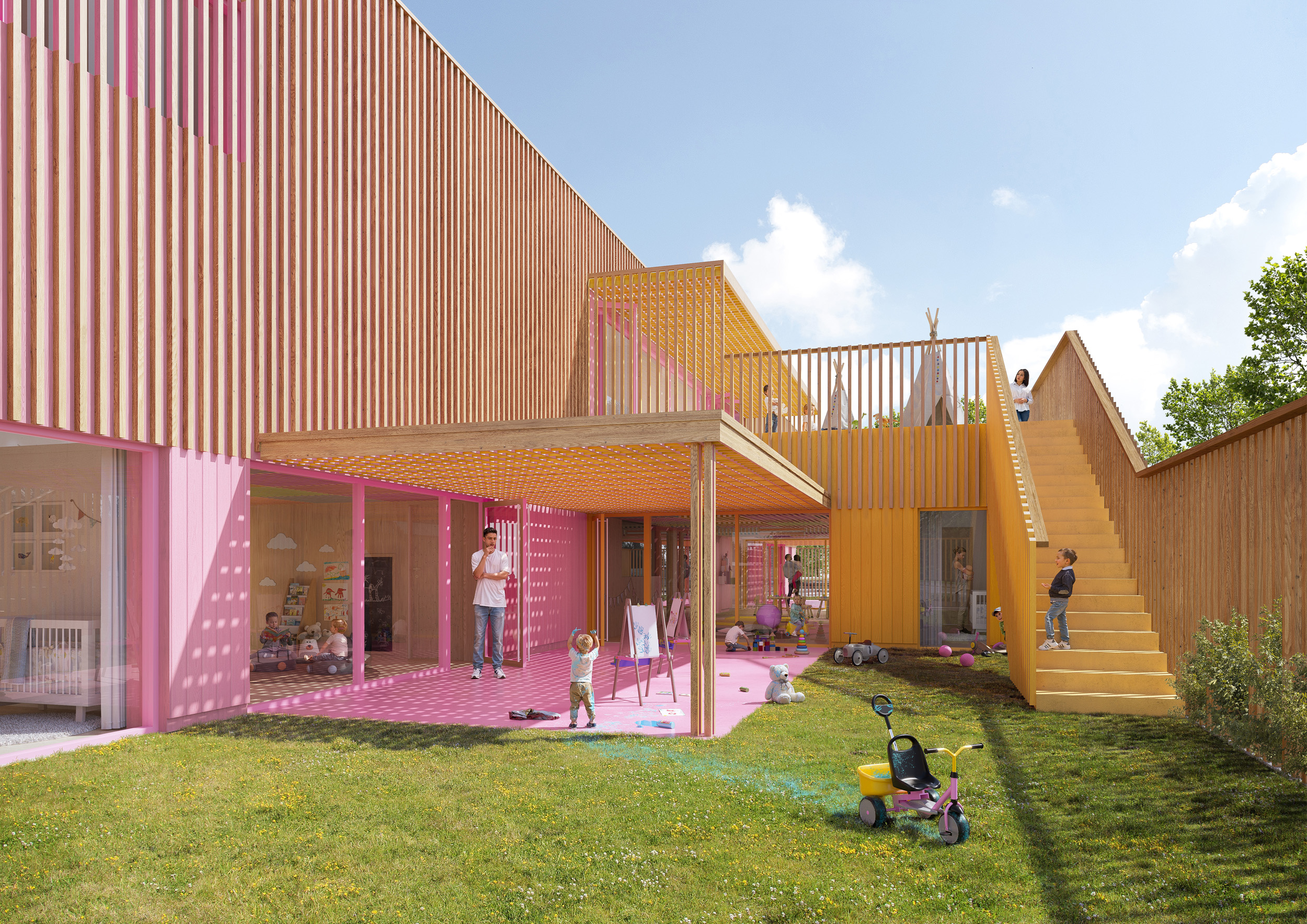 Concernant l’intégration urbaine, nous assumons de venir perturber la sobriété environnante avec une architecture joyeuse comme un enfant à qui l’on ne saurait reprocher de venir rompre un silence avec ses rires. Néanmoins, nous entendons user de la couleur de façon subtile : Les façades à ossature bois sont vêtues d’un bardage à lames bois verticales de 15 centimètres de large, lazurées d’une couleur différente sur chaque facette du bâtiment. Chaque jonction entre les lames est protégée par un tasseau en bois brut de section 5 x 5 cm. Il en résulte une façade au motif finement rayé, d’une couleur franche quand elle est vue frontalement, mais qui s’adoucit jusqu’à l’effacement à mesure que l’on regarde les façades de biais, pour ne plus voir qu’un volume en bois brut, tel que vous pouvez le voir en partie haute de la perspective sur jardin. Cette perception changeante nous a été inspirée par le phénomène d’irisation que l’on trouve sur les ailes de certains papillons, phénomène captivant qui a le don de nous émerveiller…