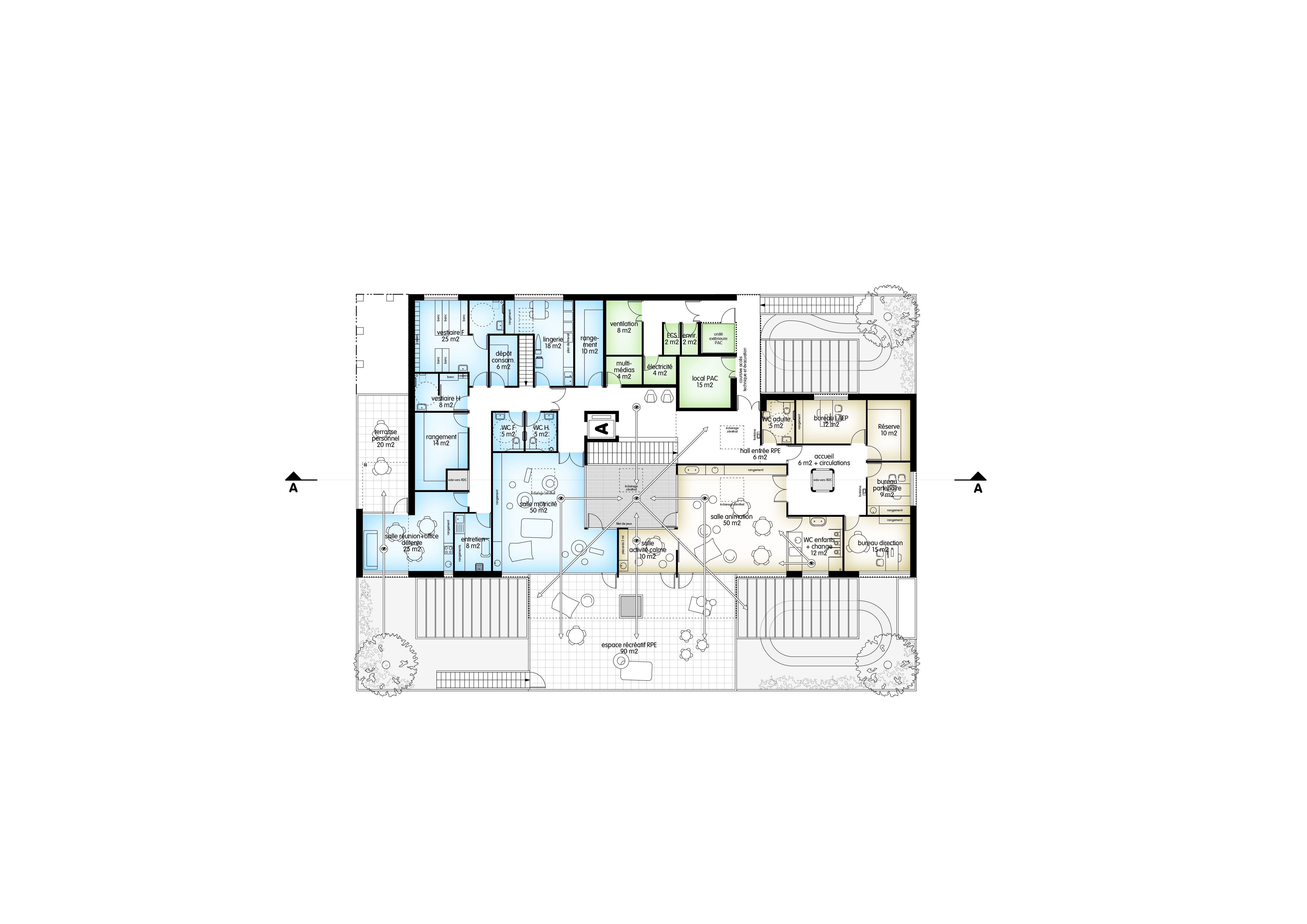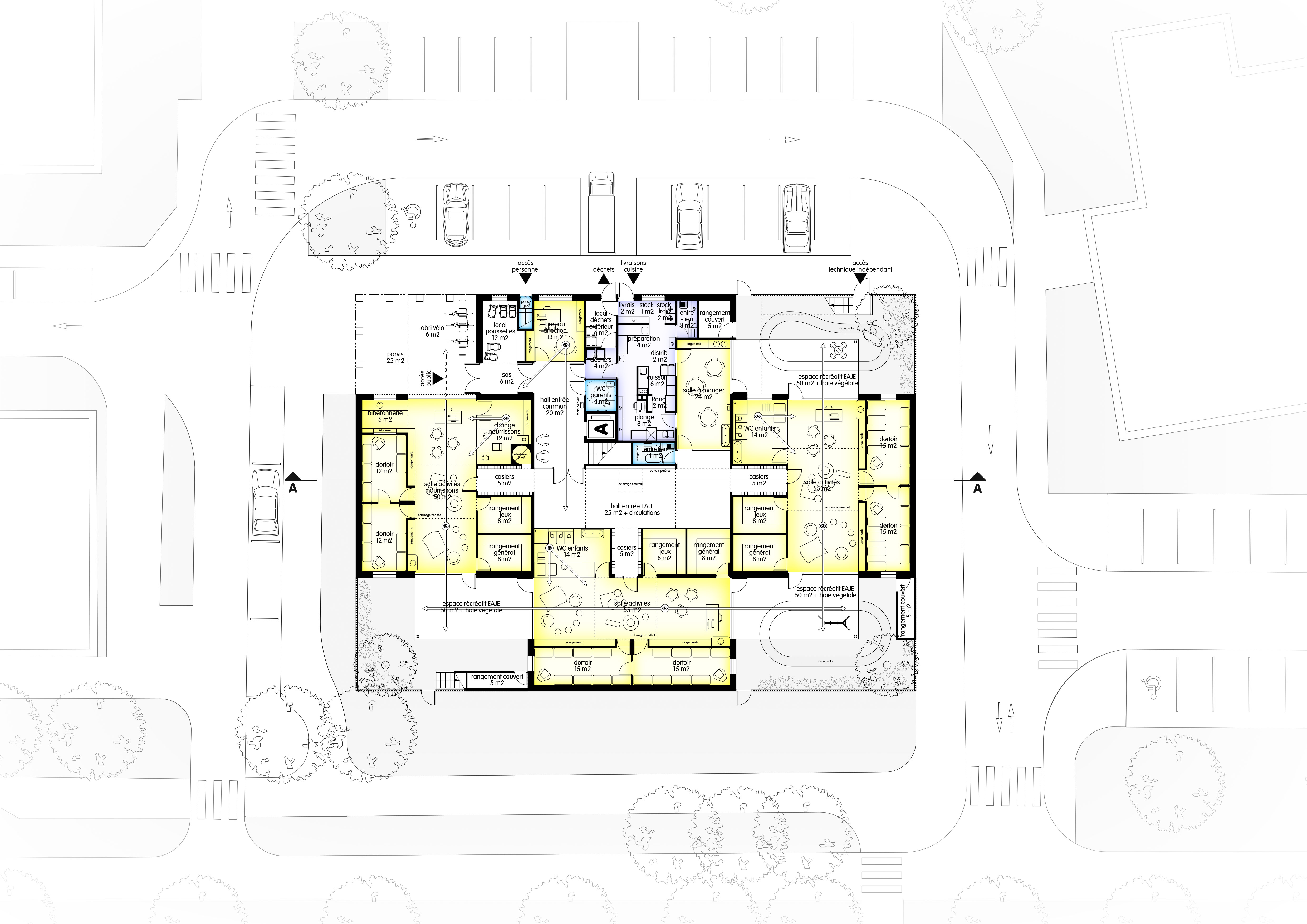 En accord avec nos principes, nous avons construit notre projet avec pour objectif de le rendre aussi fonctionnel et agréable à vivre que possible. La surface limitée de la parcelle impose globalement une implantation de la crèche en rez-de-chaussée et celle du RPE à l’étage. La crèche étant composée de trois unités, chacune disposant d’un espace extérieur, complétée d’un hall d’entrée, d’une zone d’administration et d’un parvis d’accueil, c’est un « plan en croix » qui s’est imposé à nous comme une évidence.